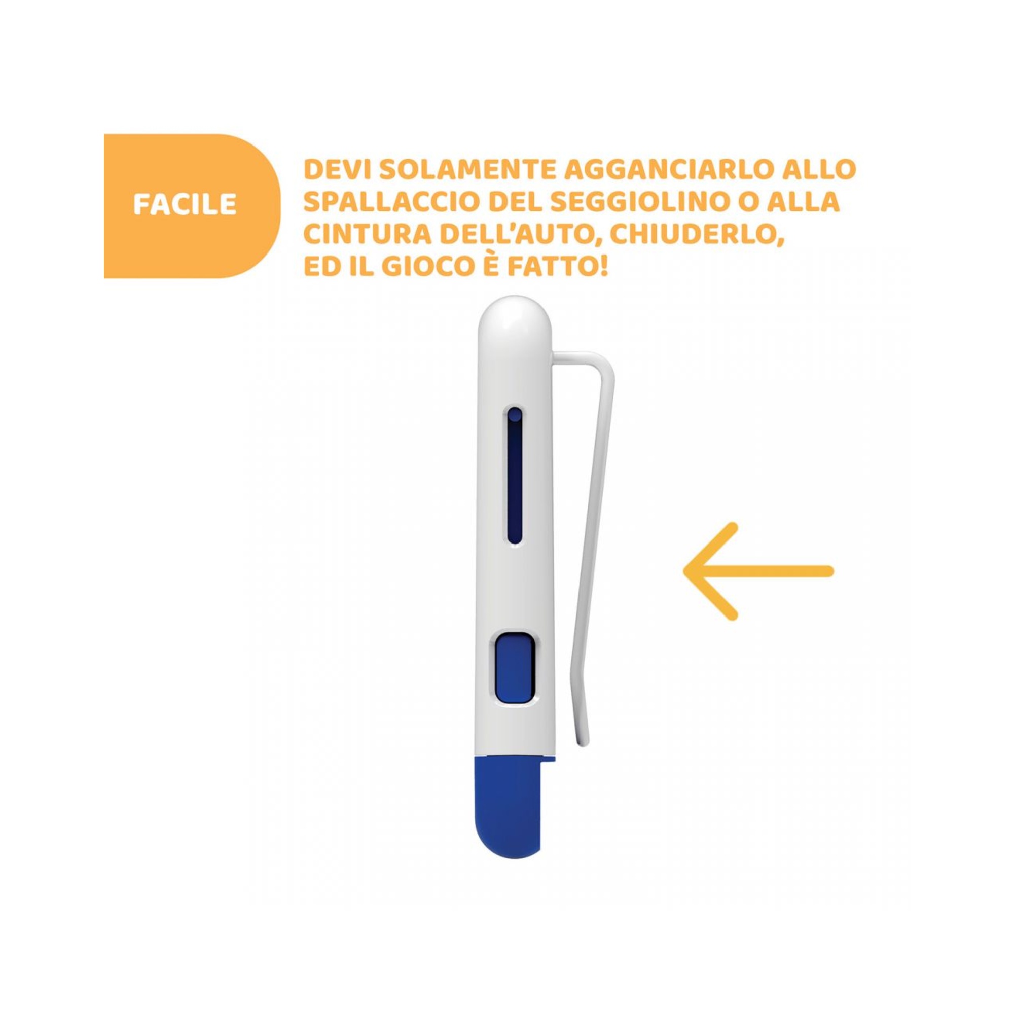 Basta semplicemente attaccare l'accessorio alla spallaccio del seggiolino o alla cintura a 3-punti dell'auto utilizzando la clip sul retro, chiuderlo e sei pronto per utilizzarlo.