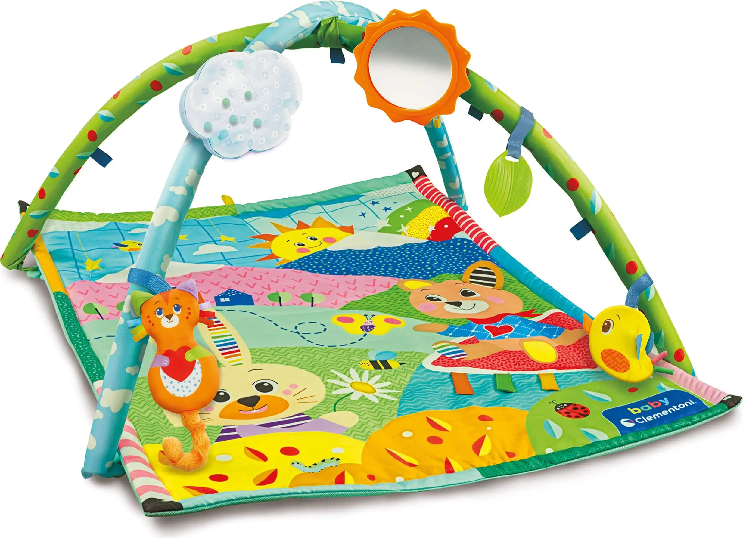 I personaggi illustrati nel tappeto richiamano gli accessori e la loro funzione, guidando i genitori nel gioco con il bambino. Tappeto e peluche lavabili in lavatrice con ciclo per capi delicati.