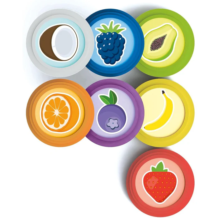 Con 7 gettoni diversi per imparare i nomi di frutta e colori.