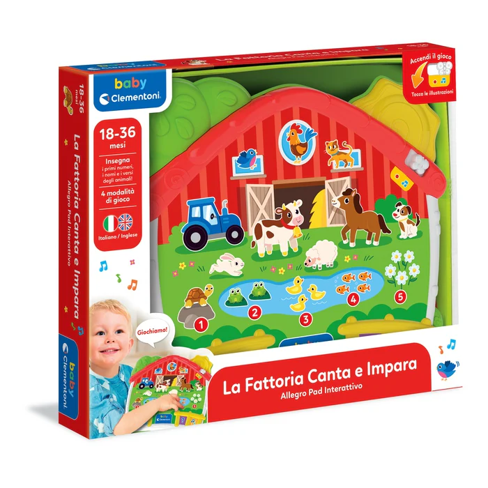 Una colorata fattoria con pannello interattivo. 4 attività di gioco per imparare parole e numeri in compagnia di tanti animali!
